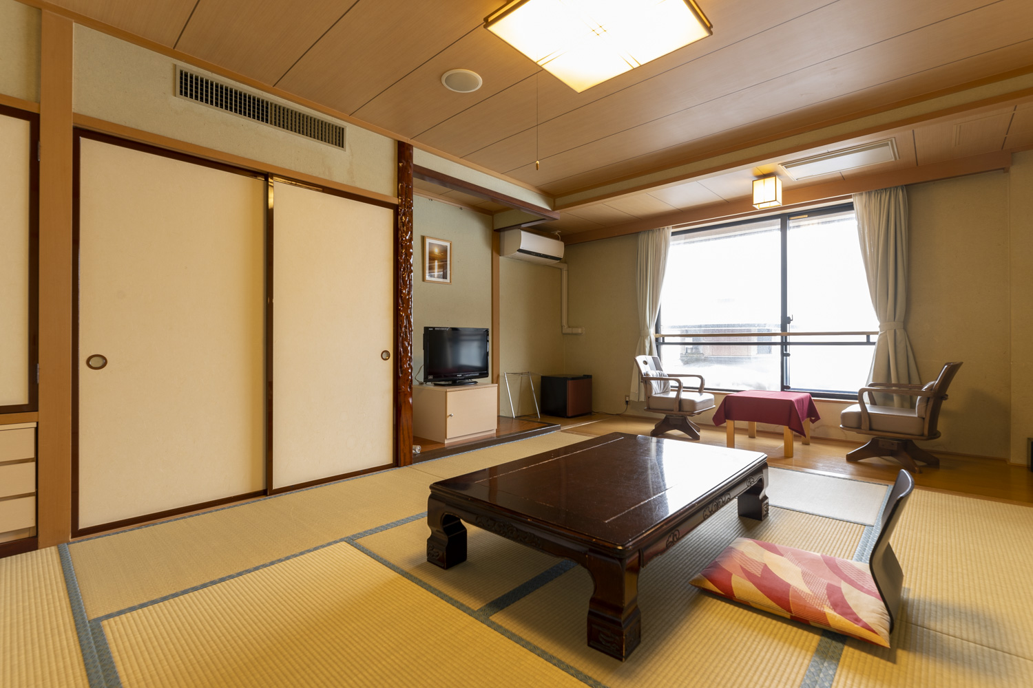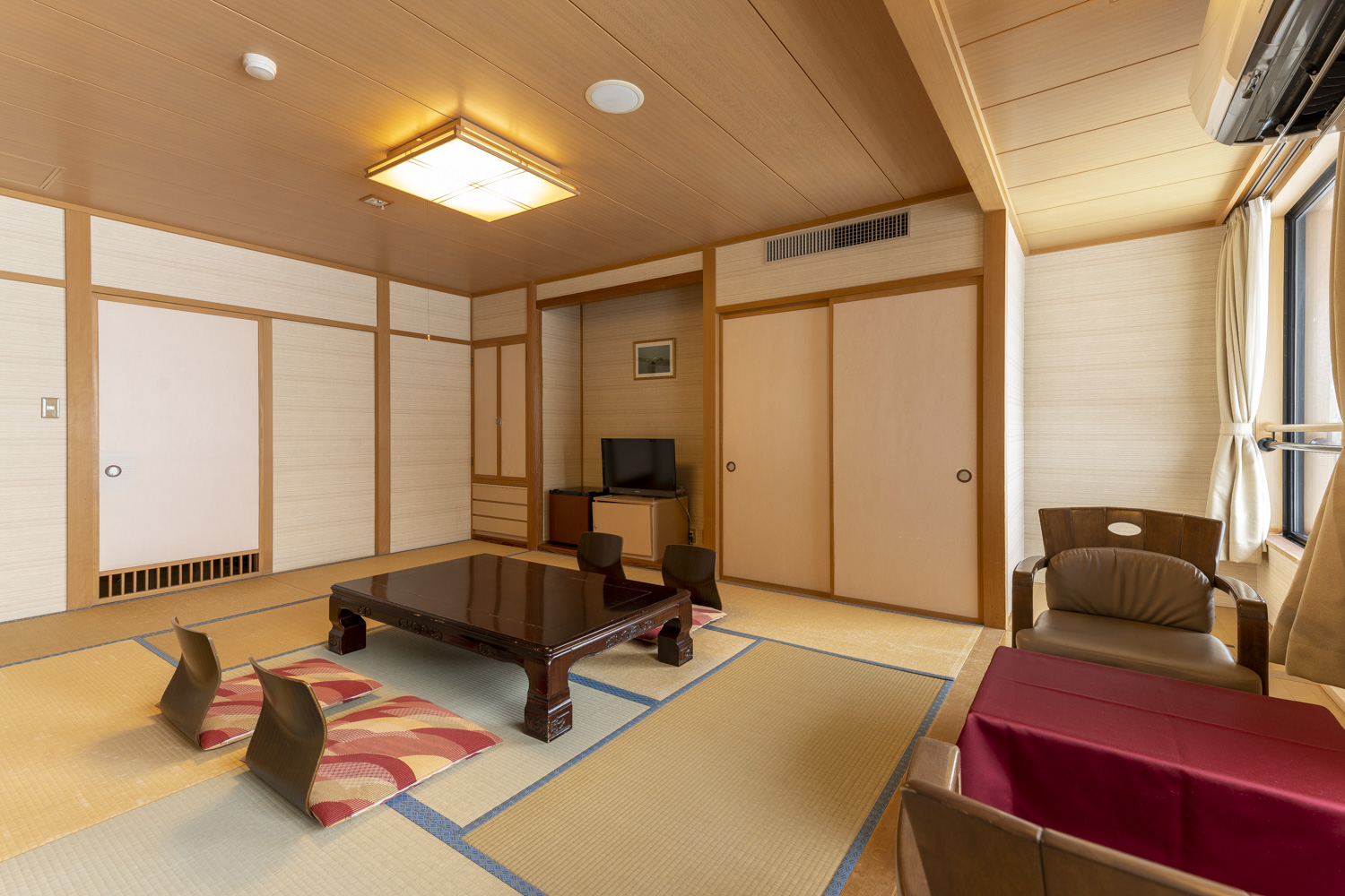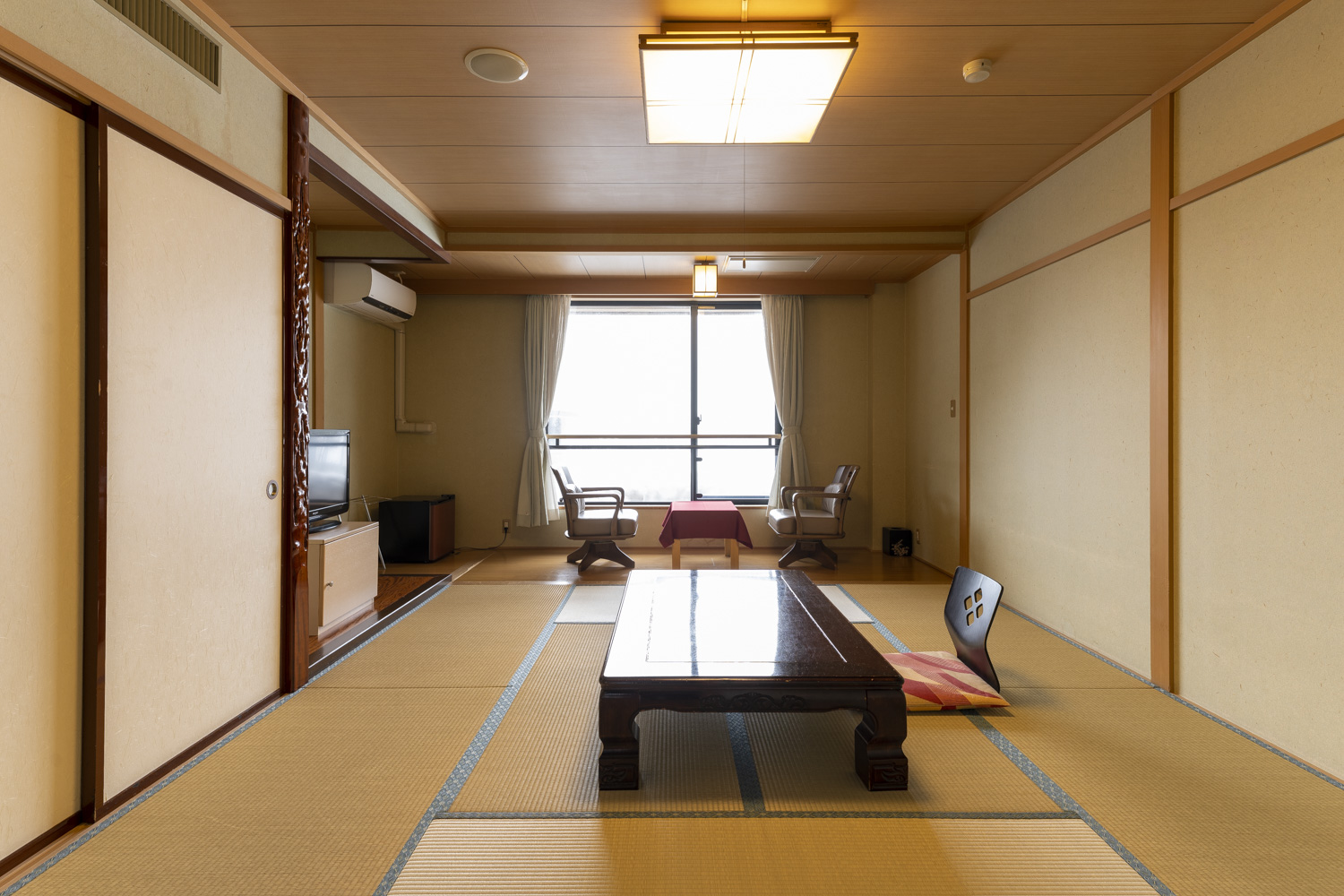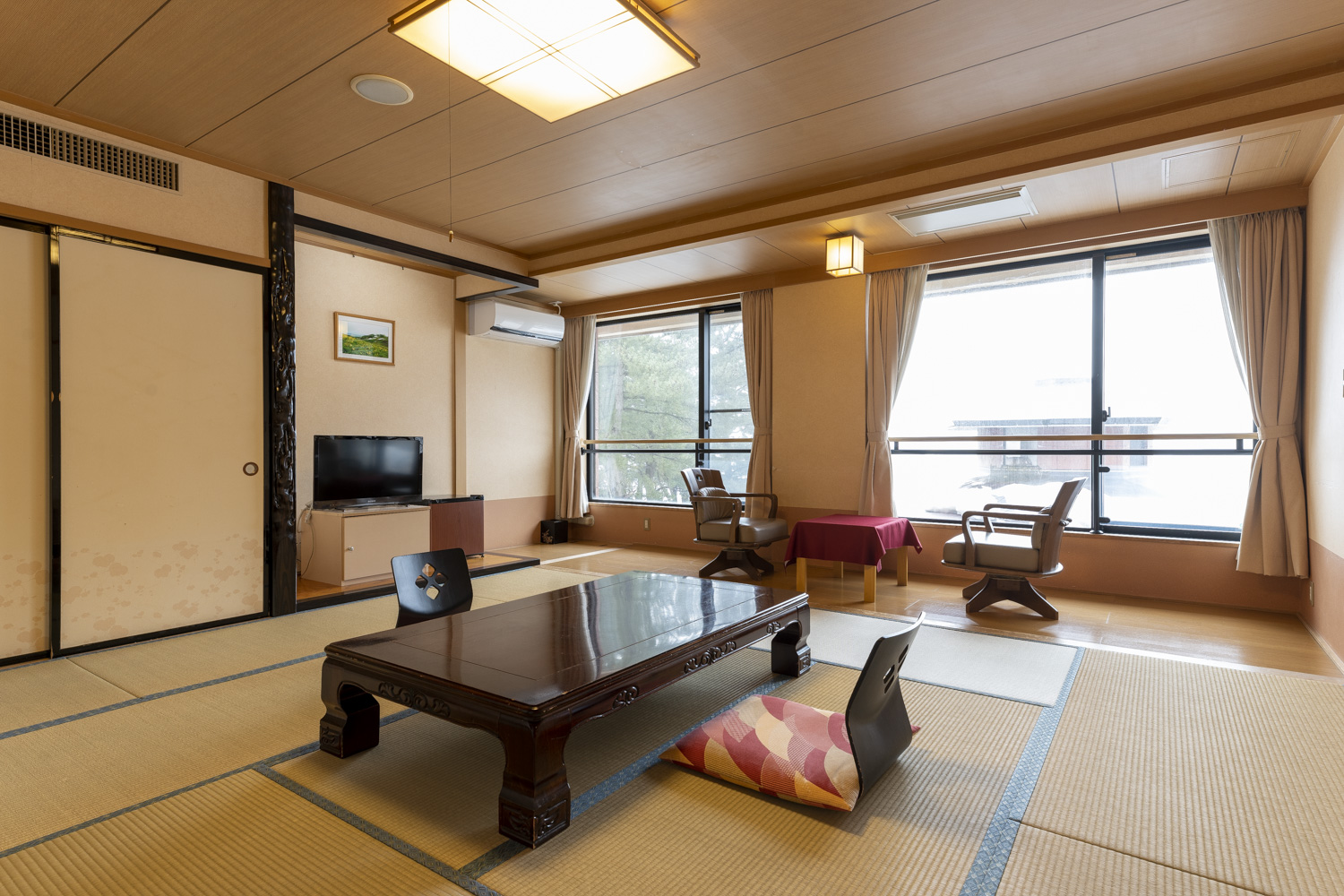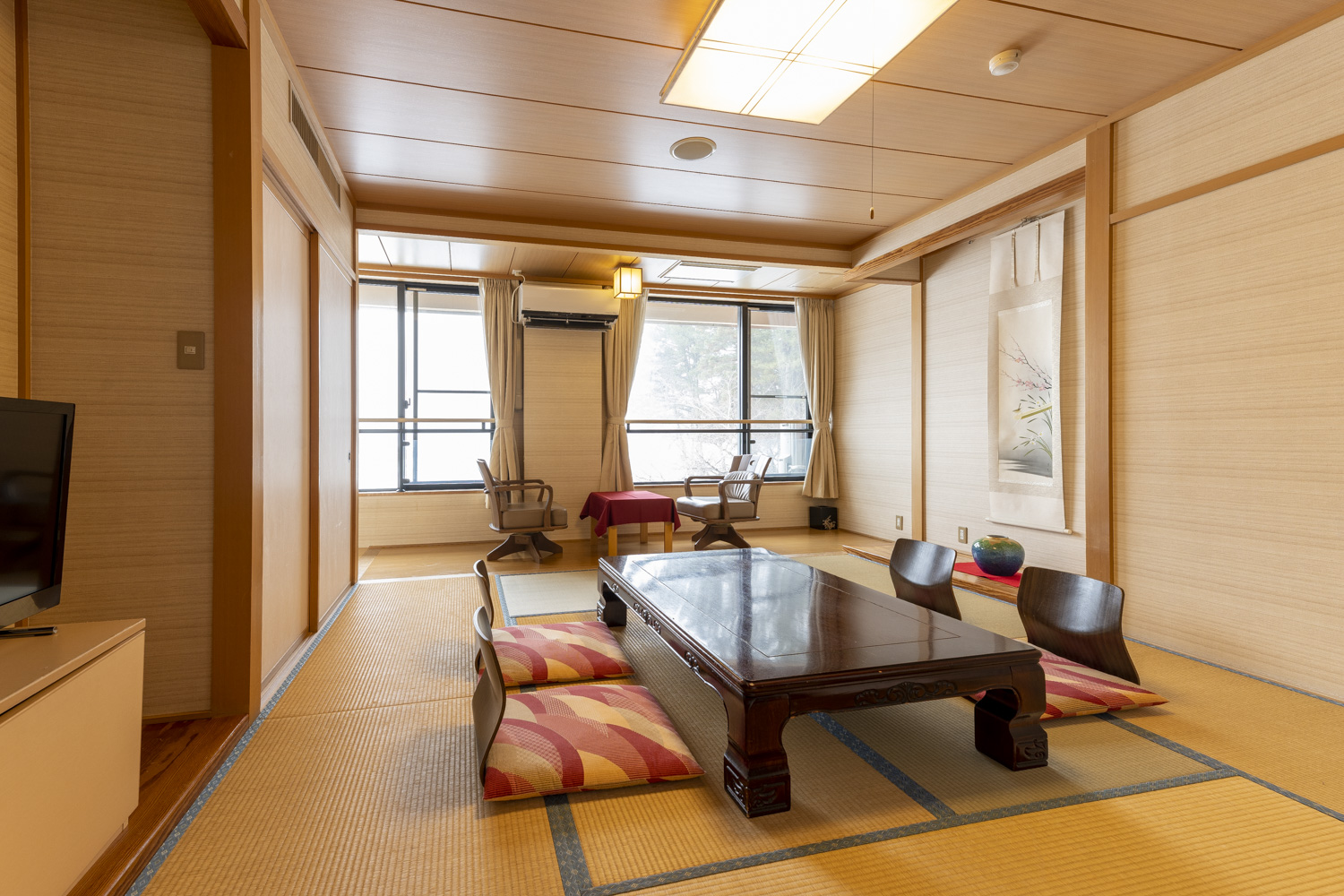南側定員4名の和室10畳。バスなし/トイレあり。津軽富士見湖、鶴の舞橋が眺望できるゆったりしたお部屋です。(一部建物で景色が遮られます)
