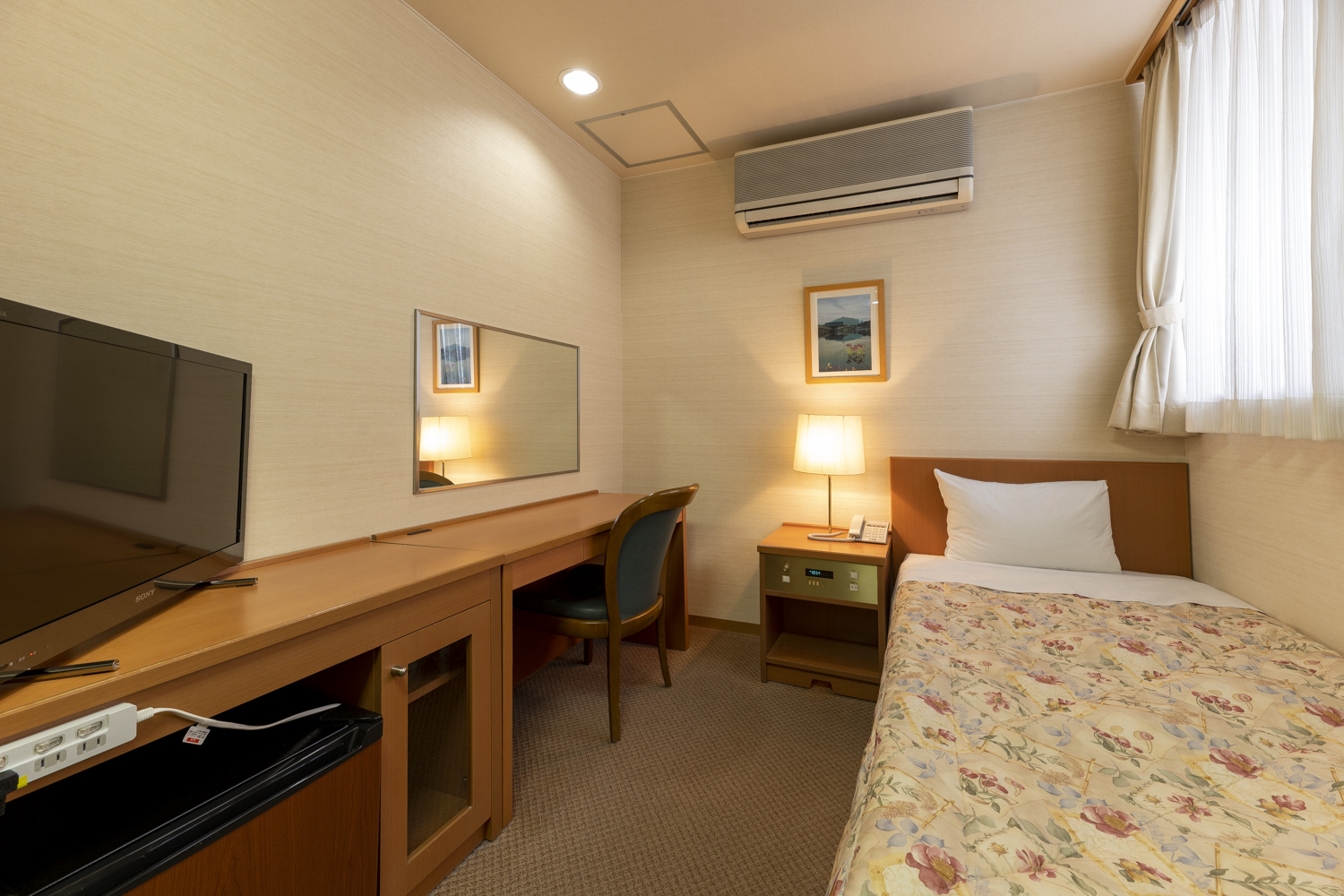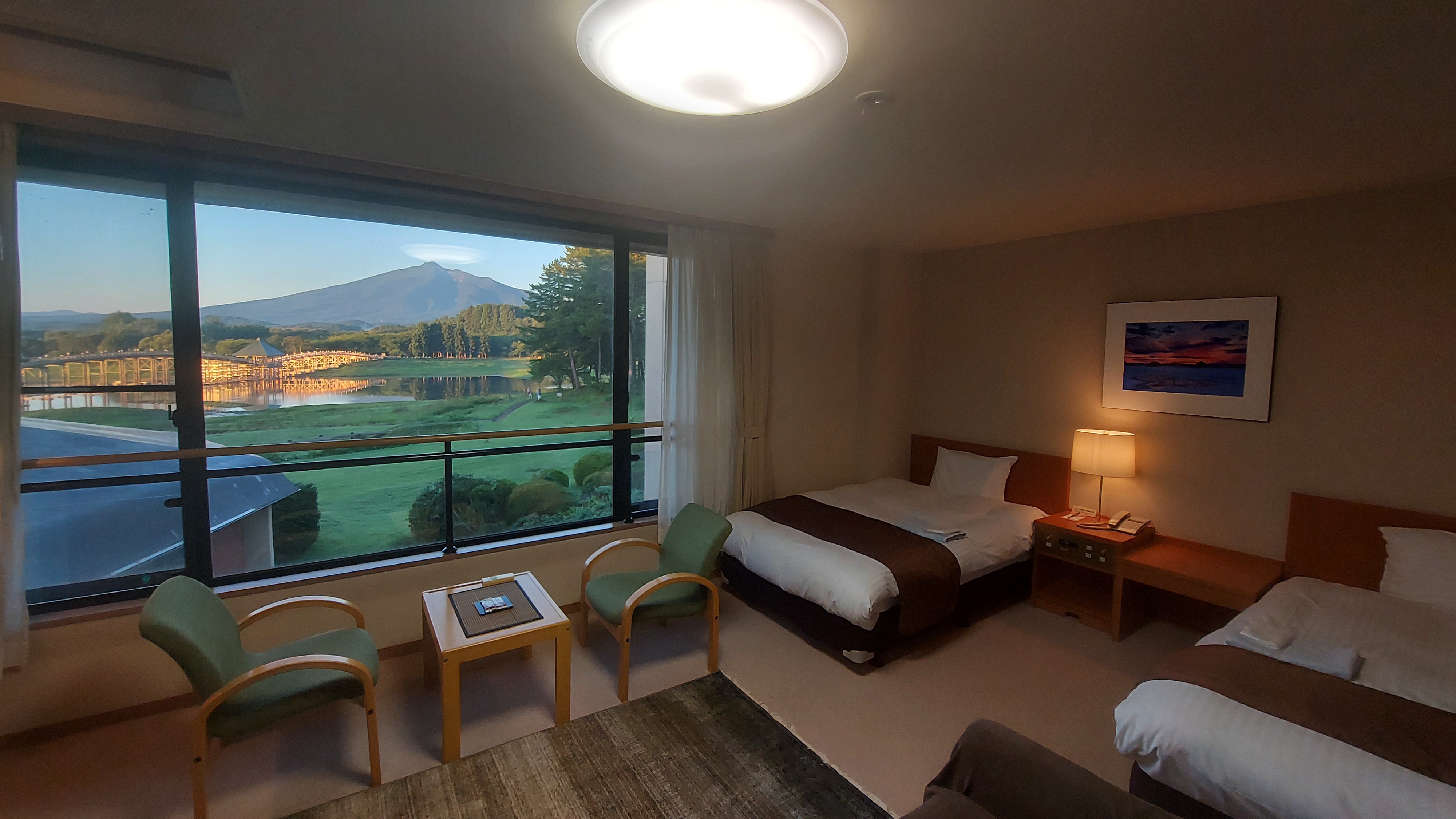 南側定員2名の洋室、ソファーベット利用で3名可。バストイレ付/バリアフリー対応。津軽富士見湖、鶴の舞橋、秀峰岩木山「津軽富士」が眺望できるゆったりしたお部屋です。
